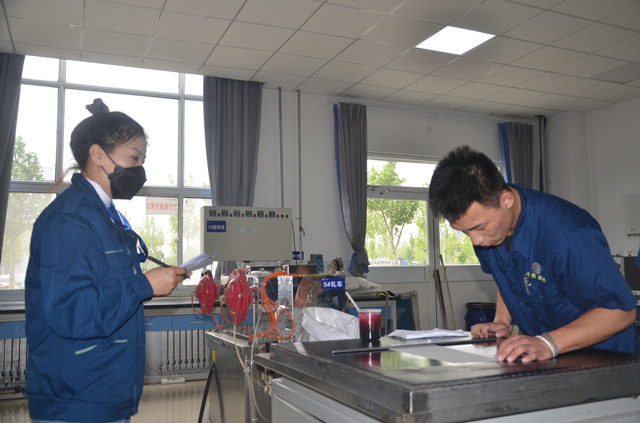 圖為4月26日公司對家紡車間化驗室新員工進行現場考評時的情形