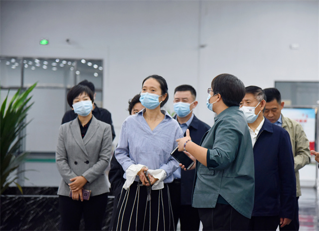 楊菡一行首先參觀了公司智云中心、服裝面料公司、花布公司、家紡公司、創意中心、工程技術研究院等,盛守祥向楊菡一行介紹了公司整體發展、智能制造、轉型升級等情況。