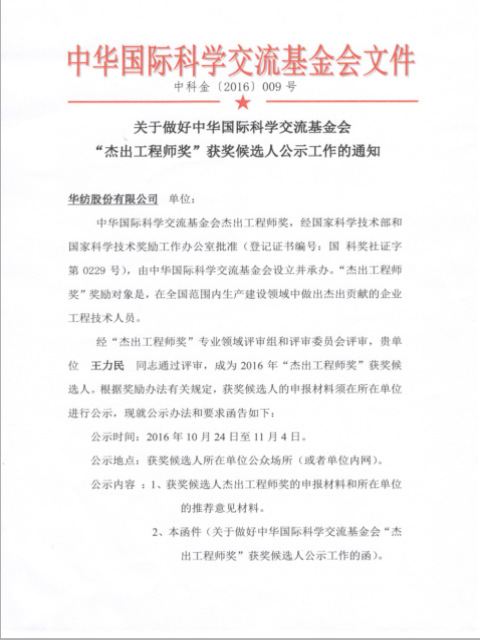 經“杰出工程師獎”專業領域評審組和評審委員會評審,華紡股份有限公司王力民同志通過評審,成為2016年“杰出工程師獎”獲獎候選人。根據獎勵辦法有關規定,獲獎候選人的申報材料需所在單位進行公示。公示如下: